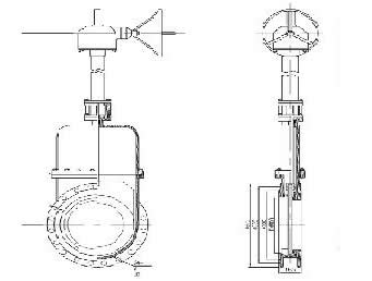DMZ573伞齿轮暗板闸阀,伞齿轮暗板排渣闸阀,伞齿轮暗板矿浆闸阀的构造图及主要外形及连接尺寸(mm)